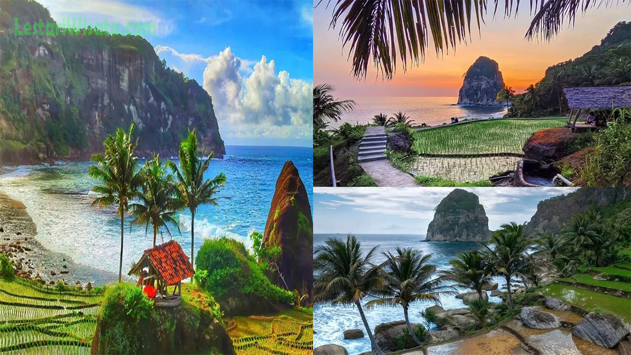 Begitu menginjakkan kaki di sini, Anda akan melihat pemandangan sawah terasering yang berundak dengan indah, menyuguhkan panorama dramatis. Tidak jauh dari situ, tebing batu megah bernama Gunung Lanang menjulang di sisi barat pantai, menambahkan daya tarik yang memikat.